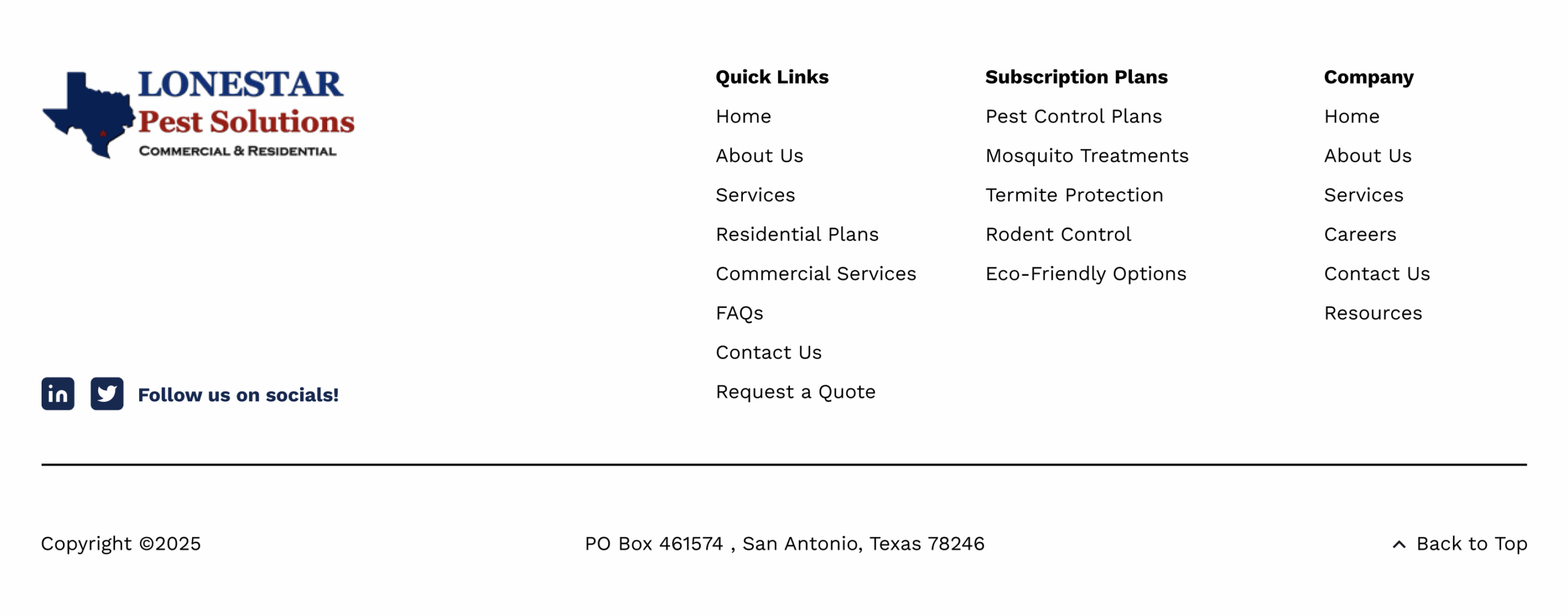 I have been with Lonestar Pest Solutions for the last 2 years. It’s always been a great experience, they have a super professional and experienced team. And the few I have called with questions they are quick to answer. Totally recommend them!